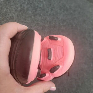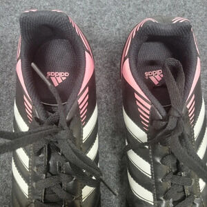 These are Adidas brand youth soccer cleats designed for boys but my daughter wore them just fine. The cleats are primarily black with white Adidas stripes on the sides, which is a signature design element of the brand. They feature pink accents on the heel and outer parts of the upper, adding a pop of color to the overall design. The shoes have a lace-up closure and molded rubber cleats on the sole for traction on grass or turf surfaces. The design is sleek and sporty, ideal for young players seeking performance and style on the field. Great for Soccer, Softball, Baseball or other sports requiring cleats.