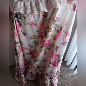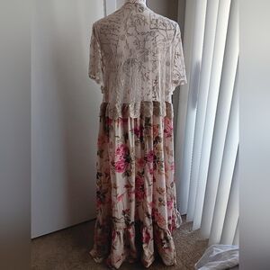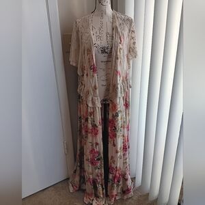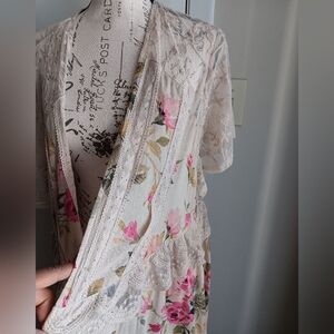Elegant floral lace kimono dress with pink and cream tones. Perfect for layering.