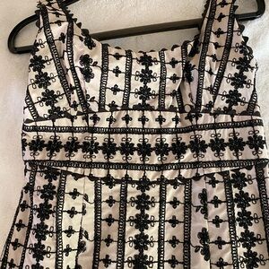 Vintage Nanette Lepore fit and flare mini dress. Y2K. Beige cotton fabric with black floral and lattice embroidery. Scallopped edge at neckline. Fully lined. Made in USA.
