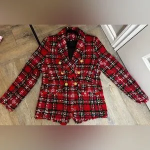 Chic statement blazer featuring classic red tweed plaid, textured fabric, and luxe gold-tone buttons. Tailored fit with a timeless, designer-inspired look. Perfect for work, brunch, holidays, or dressing up denim. Excellent condition and eye-catching in person.