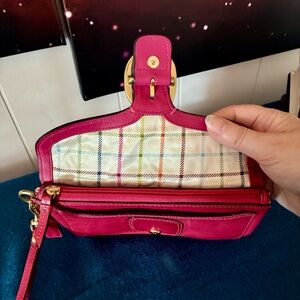 Interior is Coach’s pretty Tattersal lining with a slip pocket and zipper close. Additional exterior slip pocket within the fold-over snap closure.