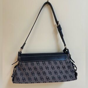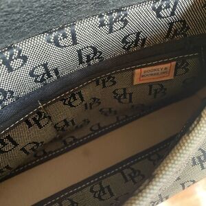 Vintage canvas gray with black logo medium size Dooney & Bourke signature tassel handbag. Interior pockets. Blue Duck charm attached. Adjustable strap.