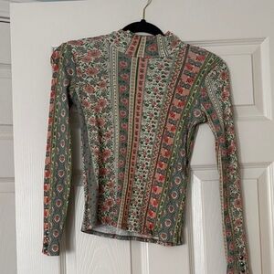 This stylish long sleeve top features a beautiful floral pattern in green and pink hues. Perfect for adding a touch of elegance to your wardrobe.