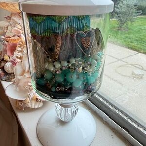 BEAUTIFUL This large, beautifully curated mystery jewelry jar is centered around an ocean-inspired blue and aqua color palette, featuring sea-glass tones, turquoise hues, teals, and soft greens throughout.