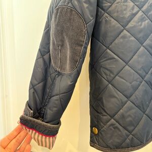Vintage Jack Wills navy quilted chore jacket with button closure and cozy lining, corduroy collar and elbow pads, and fun pink striped sleeve lining you can fold over. So cute and so classic white still remaining on trend! Perfect for milder days, spring and fall.