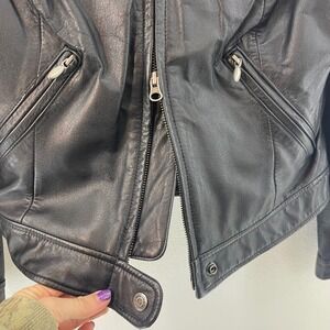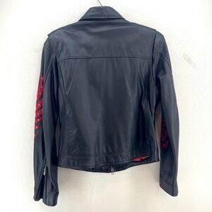 Own the road with this iconic Harley Davidson leather jacket. Feel the premium quality of genuine leather that molds to your body, offering both protection and unparalleled style. It's been kept in extraordinarily amazing condition. Bold red flames adorned with shimmering studs ignite the sleeves, creating a striking visual statement that commands attention. Silver-tone hardware, including a dual-zip front closure, dual chest pockets with snap closures, and zippered hand pockets, adds a touch of rugged sophistication. The sleeves are also adorned with zippers at the wrist. The satin lining ensures comfortable wear, making it perfect for cruising down the highway or enjoying a night out with friends.