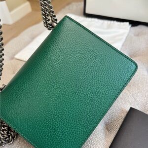 This is an authentic GUCCI Calfskin Mini Dionysus Shoulder Bag in Emerald. This chic bag is crafted of calfskin leather in green. The shoulder bag features a ruthenium silver chain shoulder strap and a textured aged gold horseshoe closure with emerald stones and lion heads at the end. This opens to a front flap pocket and beige fabric interior.