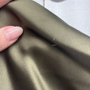 There are a few faint stains/marks on the fabric (shown in photos). They are not very noticeable when worn due to the sheen and drape of the material. I’ve included clear close-ups as well as a try-on photo for reference so you can see how it looks on.