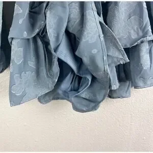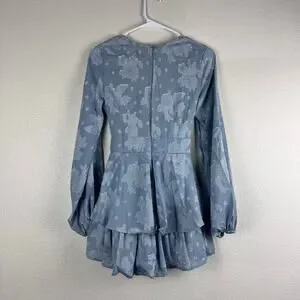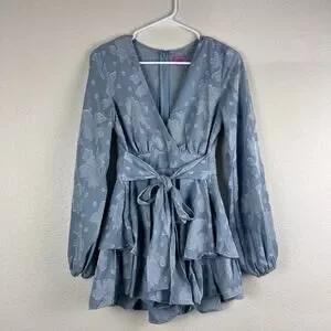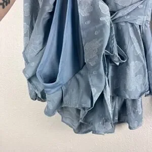 Mi Ami by Francesca’s Brandie Floral Jacquard romper in a soft light blue color. This romper has the look of a dress with a flowy layered skirt but includes built-in shorts underneath for comfort and coverage. Features a textured floral jacquard fabric, deep V-neckline, wrap-style bodice, adjustable waist tie, and long balloon sleeves with elastic cuffs for a flattering silhouette. Perfect for weddings, showers, brunch, photos, or other dressy occasions.