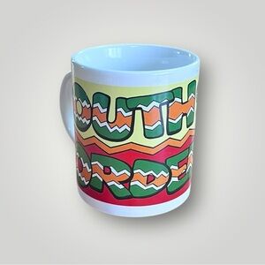 South of the Border coffee cup/mug. Bright colors across the entire cup saying, “SOUTH OF THE BORDER” and a man resting across a cactus. Great preowned condition, decorative display. Dusted off, not washed with water. Please see details and measurements in photos!
