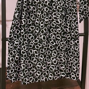 Featuring a timeless black base with white abstract geometric print, this dress transitions effortlessly from the office to after-hours events.