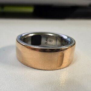 Note that the color is Rose Gold, but it does come off very Gold. Size 8. Make sure you are choosing this size if it will fit comfortably around your finger, not too snug, as it is an electronic device and on the thicker side.