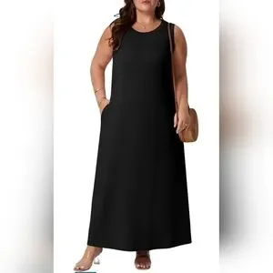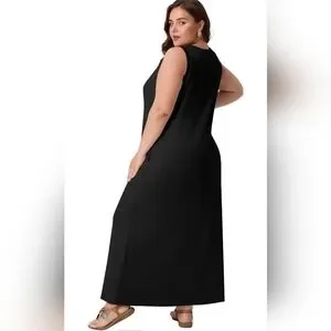Brand new with tags, just arrived. New 2026 release. This plus size black maxi dress features a flattering sleeveless design with an empire waist that flows effortlessly over the body. Made with comfort in mind, this dress includes functional side pockets and a soft, drapey silhouette that is easy to wear all day.