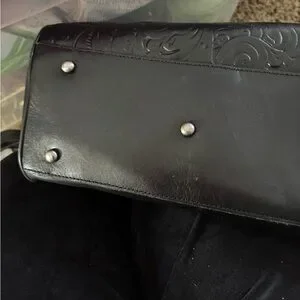 Chic black satchel with intricate embossed floral design. Perfect for elevating any outfit.
