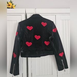 Stylish Cinq a Sept black jacket featuring bold red heart accents. Perfect for adding a touch of fun to your wardrobe.