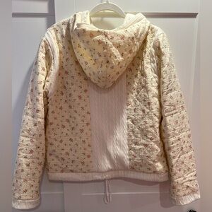 Chic cream puffer with floral accents. Features a cozy hood and front zipper. Ideal for layering.