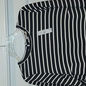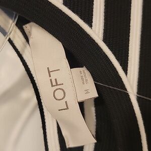 Chic LOFT knit dress with bold black and white stripes. Ideal for versatile styling.