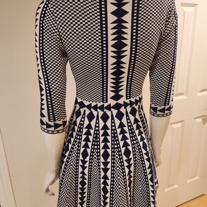 Nina Leonard Navy and White Patterned Long Sleeve Dress
