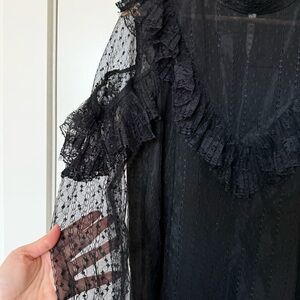This elegant black lace top features delicate ruffles and sheer sleeves, perfect for a sophisticated look. Ideal for both casual and formal occasions. Fully lined, a bit sheer, very sexy and beautiful.