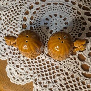 Cute cinnamon brown set of ceramic salt & pepper shakers with whimsical squirrel handles and embossed leaves. They were made in Japan between the 60s and the 70s and are numbered 7669. For collectors or squirrel and woodland vibe lovers!