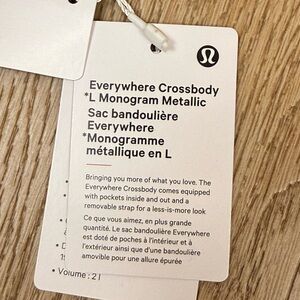 Lululemon Everywhere Crossbody Monogram Metallic Bag in Blissful Pink with gold monogram detailing. New with tags. 2L capacity with a compact, hands-free design that fits daily essentials.