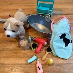 Includes plush tan dog and grooming accessories. Features tub and cart. Perfect for imaginative play. Dog has some signs of use from years of love.