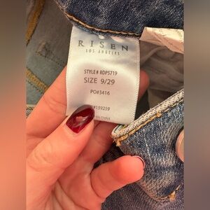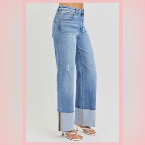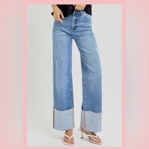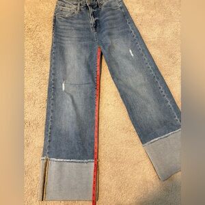 Risen Chic Light Blue Wide Leg Jeans with chuffed bottoms w/ light distress 9/29