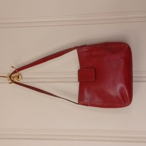 This vintage Fossil red leather shoulder bag is perfect for any occasion. Its sleek design, sheen, and vibrant color make it a standout accessory. Magnetic snap closure. Strap narrows from bag to shoulder (1 1/2" to 3/4"). Double stitching throughout. There are two large sections inside with a full zippered pocket in between. One of the sides has a small open pocket (keys?), and the other has a medium zippered pocket. There is very little show of wear on the corners and is in great clean vintage condition. Ideal for adding a pop of color to your outfit.