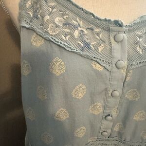 Chic light blue midi dress with delicate lace details. Sleeveless design for a breezy feel. Perfect for casual outings. Fun and flowy dress with pockets. Worn a few times… a small part of lace came undone and needs to be restitched see pics