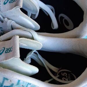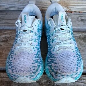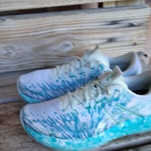 Stylish ASICS shoes with a white and aqua design. Ideal for running and workouts.