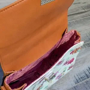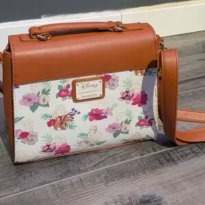 This stylish crossbody bag features a vibrant floral design of each Disney princess in cream and brown. Ideal for enhancing any ensemble with a touch of princess elegance.