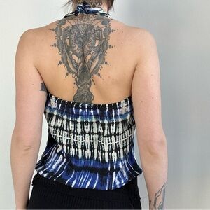 Cute silky top with a Y2K vibe. So cute for spring, this top has an open back and halter neckline. It has a tie up at the neck, and a blue/black design to it. Nice deep v and gathered bottom. New without tags, never worn.