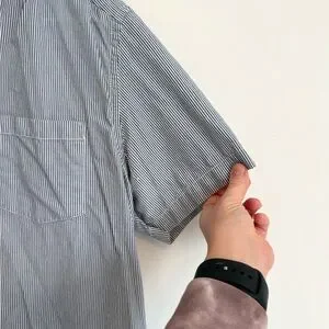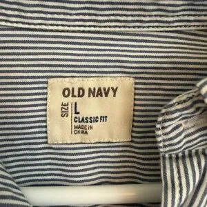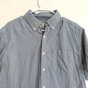 Old Navy men shirt, men’s button down shirt, short sleeve button up, blue white striped shirt, pinstripe shirt, striped button down, casual menswear, classic fit shirt, cotton shirt, summer shirt, spring summer top, work shirt, business casual shirt, everyday shirt, office wear, weekend wear, vacation shirt, preppy style, smart casual, breathable cotton, mens large L