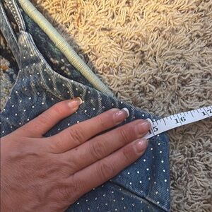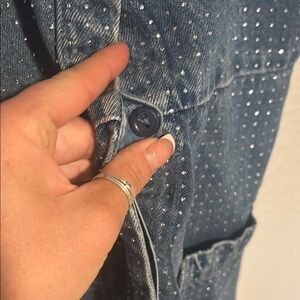 Denim look, rhinestone embellished, 2 front pockets Sleeveless, v-neck, mini dress