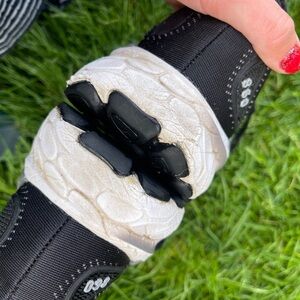 Slight wear in the back of heels cracking of foam on the sides. None of which interfere with the comfort