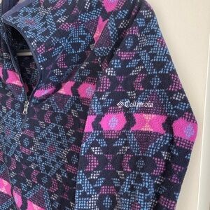 Chic Columbia pullover fleece with a striking geometric pattern. Features blue and pink hues. Ideal for everyday wear.