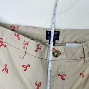 J.Crew high-rise girlfriend chinos in classic khaki tan with an all-over red lobster print, inspired by New England coastal style and fisherman heritage, featuring sturdy cotton twill with a touch of stretch, tapered leg, cuffed hem, belt loops, and button/zip closure.