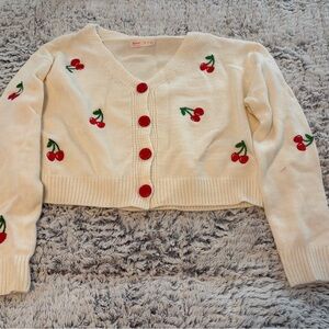 Charming cream cardigan with cherry details. Red buttons add a playful touch. Ideal for casual wear.