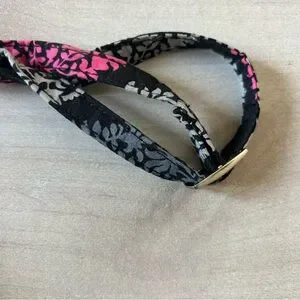 Measures approximately: 8" long x 6" wide x 1" deep. Strap is adjustable in length. Quilted. Snap flap opening with ID window and two slip in pocket sections. Zipper top closure in two sections with ample room for storage. Large slip in pocket at back. New never used without tag. Pink and grey with black and white.