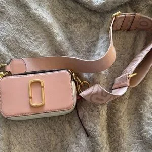 Elegant Marc Jacobs crossbody bag in pink and cream. Features gold hardware and adjustable strap. Ideal for everyday use.