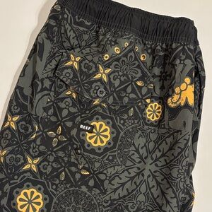 Comfortable Reef shorts with a sleek pattern. Ideal for everyday wear. Side pockets and one button top pocket in back. Elastic waist features drawstring.