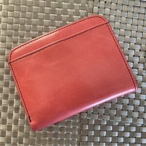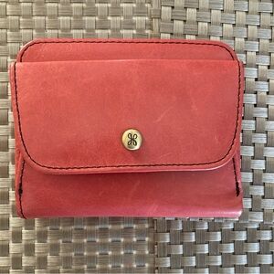 Stylish pink salmon ("cherry blossom") color genuine leather wallet by Hobo. Features a coin purse section the folds out. Slots for cards, ID/photo. Snaps shut.