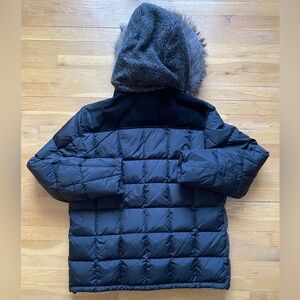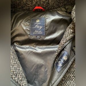 Elegant Fay jacket with a textured design. Features a stylish blend of black and gray tweed with fur around hoodie.