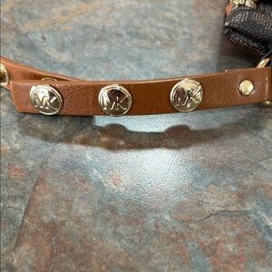 Take your travels to the next level, chic coated canvas/faux leather NWT Michael Kors belt bag with dark brown monogram. Gold chain accent. Adjustable strap for comfort around waist. Measurement 25-27". Can fit your passport, money and lipstick.😊