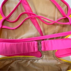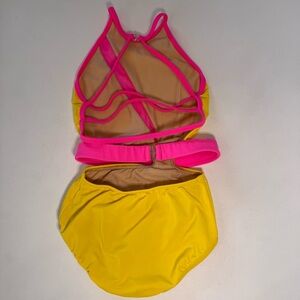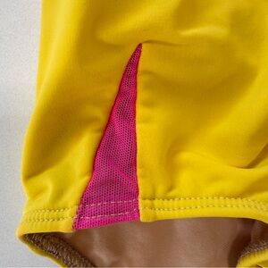 LA Dance Designs Yellow and Pink Leotard Child Large with mesh inserts and fully lined. Bright and eye-catching LA Dance Designs leotard featuring a bold yellow base with hot pink trim and mesh inset detailing. It has a high-neck design with a diagonal mesh accent and secure clasp closure at the top and then around the waist as well. Perfect leo to stand out at convention classes or even use as a base for a solo cosutme. In excellent used condition.