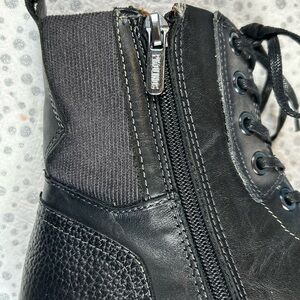 Elegant gray/black leather boots with lace-up design. Features side zippers for easy wear. Durable and stylish for versatile use. They look unworn, except for a few stuff marks on the top. See last picture. European size 37.