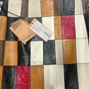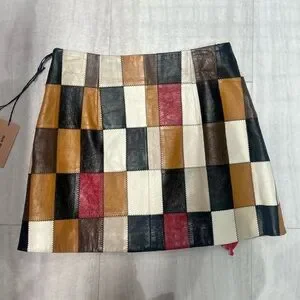 Chic leather mini skirt with patchwork design. Features black, brown, red, and cream squares. Bold and stylish look.
