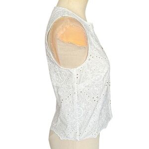 Discover elegance with this sleeveless eyelet blouse, featuring a classic button-down design. Perfect for any occasion, this top combines style and comfort effortlessly.