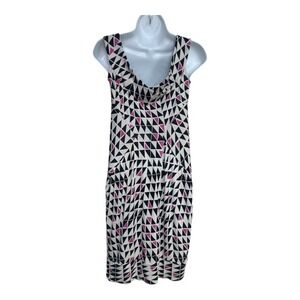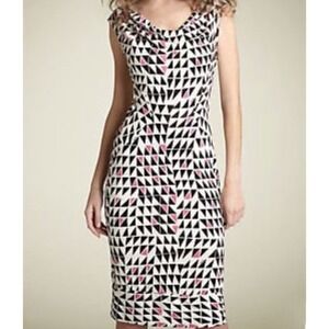 A Diane von Furstenberg silk dress showcasing a striking geometric print. This sleeveless dress features a flattering cowl neckline and a sheath silhouette. Its unique pattern of black, white, and pink triangles creates a modern and eye-catching design. Perfect for a business casual setting, a sophisticated lunch, or an evening cocktail party.
