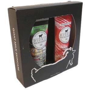 Indulge dry hands with Dionis Goat Milk Skincare Hand Cream Nutcracker Peppermint Twist Duo Pack. Two 1 oz tubes nourish with creamy goat milk, soothing oils, and festive peppermint scent, leaving skin soft, smooth, refreshed, and holiday ready cheerfully scented.